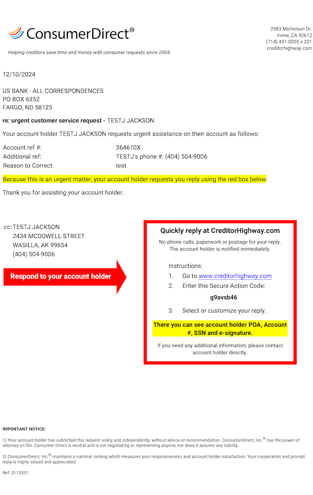 With our proprietary technology, CreditorHighway can help you easily and safely respond to your consumer requests without any calls, writing letters or sending mail. After entering in your 8 digit secure code, you will be able to see the details of your consumer's request. Simply select a response or enter one of your own. The response will go immediately and directly to your consumer. With our platform, you have all the information you need to respond to their request and they'll receive it immediately!